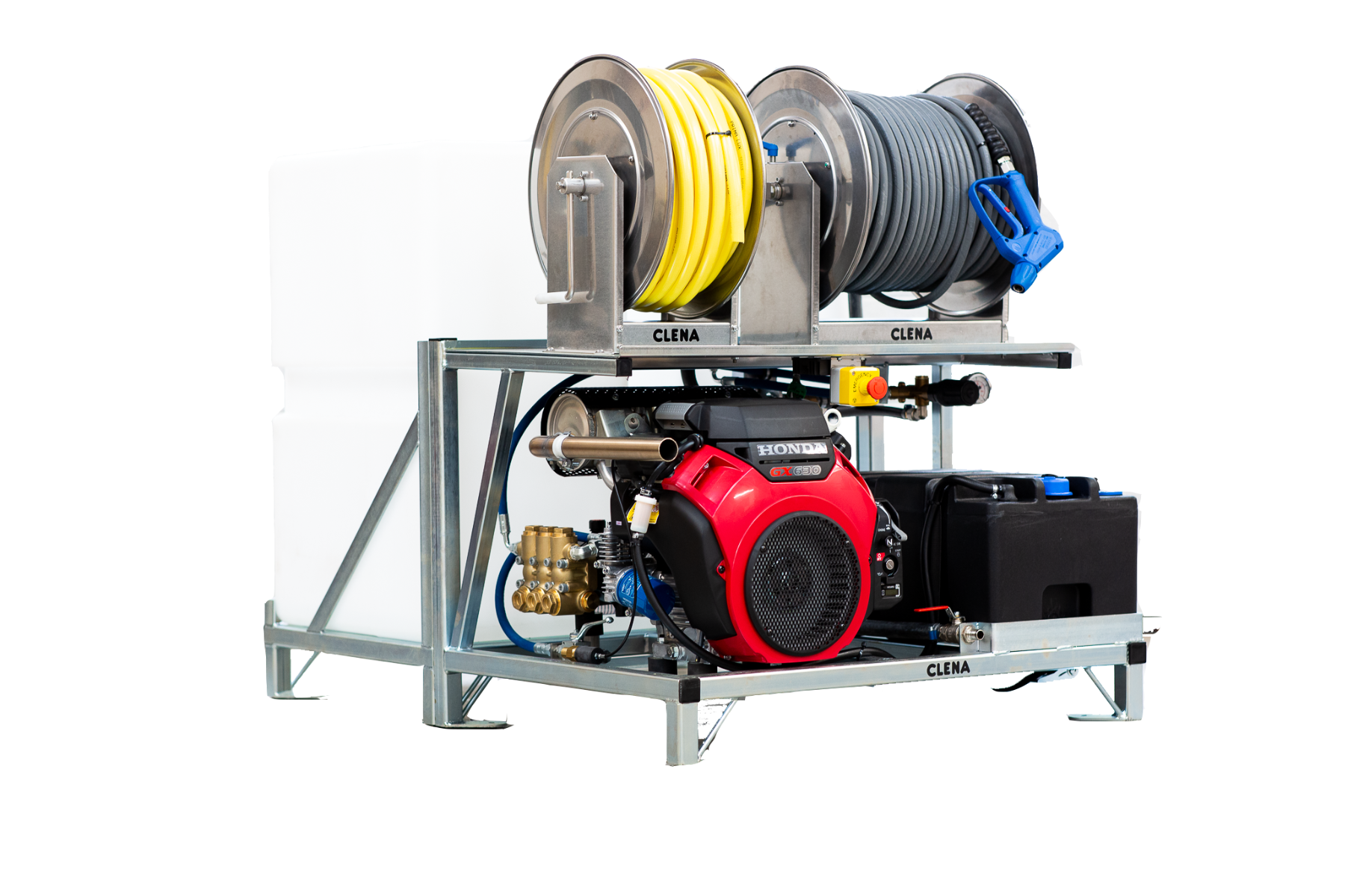 Højtryksanlægget har en benzin Honda motor med 22,1 hestekræfter. Der medfølger også 50m højtryksslange, spule-håndtag, lanse, tilgangsslange og 2 manuelle slangetromler. Kemi Injektor kan påmonteres som ekstra-udstyr.